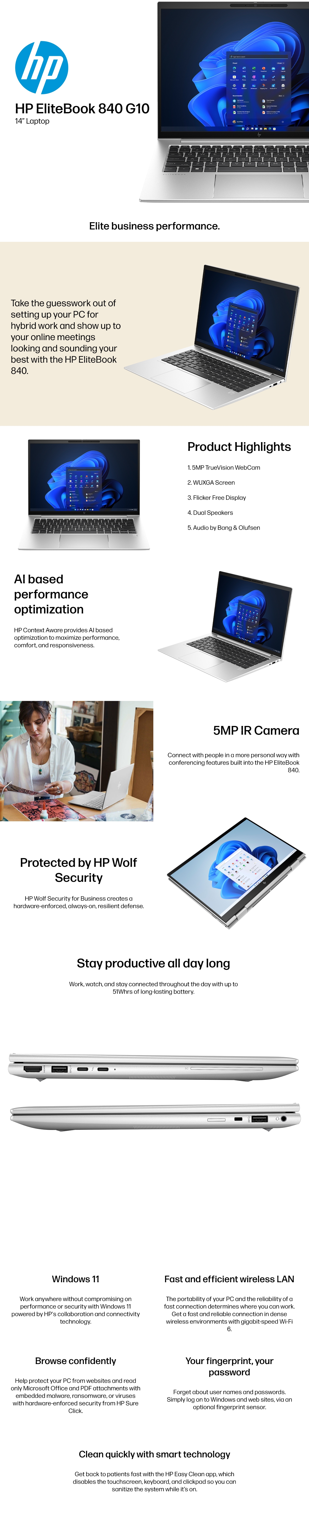 HP EliteBook 840 G10 14" Business Notebook / PC - Display: 14" IPS WUXGA (1920x1200) - CPU: 13th Gen Intel Core i5-1335U - Memory: 1x 16GB DDR5 4800MHz (2x SODIMM Slots) - Storage: 256GB PCIe NVMe SSD - Graphics: Intel Iris Xe - Network: WiFi 6E AX211, Bluetooth 5.3 - I/O: HDMI 2.1, 2x USB-C Thunderbolt 4, 2x USB-A, 3.5mm Audio Combo - Windows 11 Pro (preinstalled with Windows 10 Pro Downgrade) - 5MP IR camera - Backlit Keyboard - 86S14PA