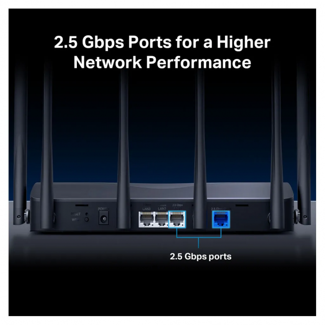 • 2.5 G Ports: 1× 2.5 Gbps WAN port, 1× 2.5 Gbps LAN port and 2× 1 Gbps LAN ports break through the 1G bottleneck, driving your devices to peak performance