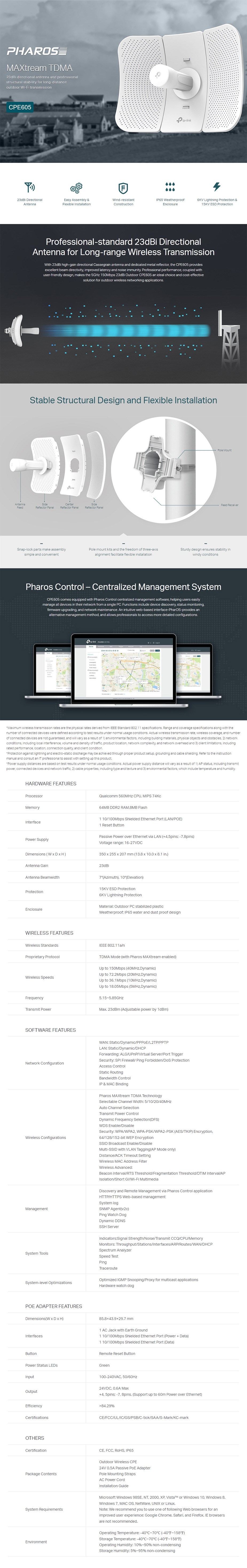 TP-Link CPE605 5GHz 150Mbps 23dBi Outdoor CPE - Processor: Qualcomm 560MHz CPU, MIPS 74Kc - Memory: 64MB DDR2 RAM,8MB Flash - 1x 10/100Mbps Shielded Ethernet Port (LAN/POE) - Power: Passive Power over Ethernet via LAN, Voltage range: 16-27VDC - Antenna Gain: 23dBi - Protection: 15KV ESD Protection, 6KV Lightning Protection - IEEE 802.11a/n - CPE605 - 3 Years Limited Warranty