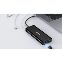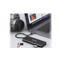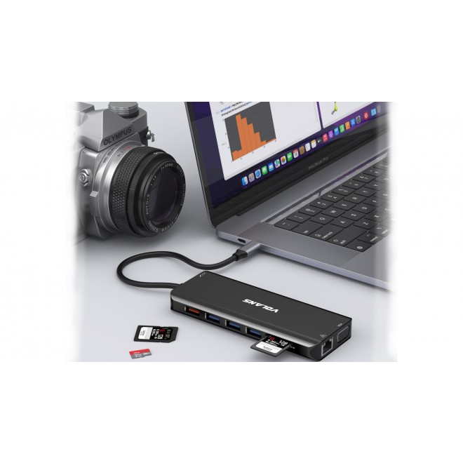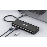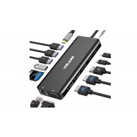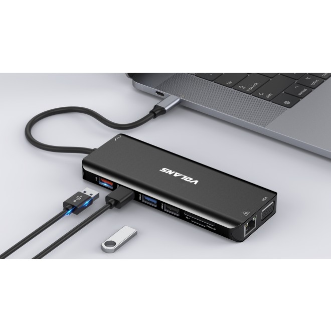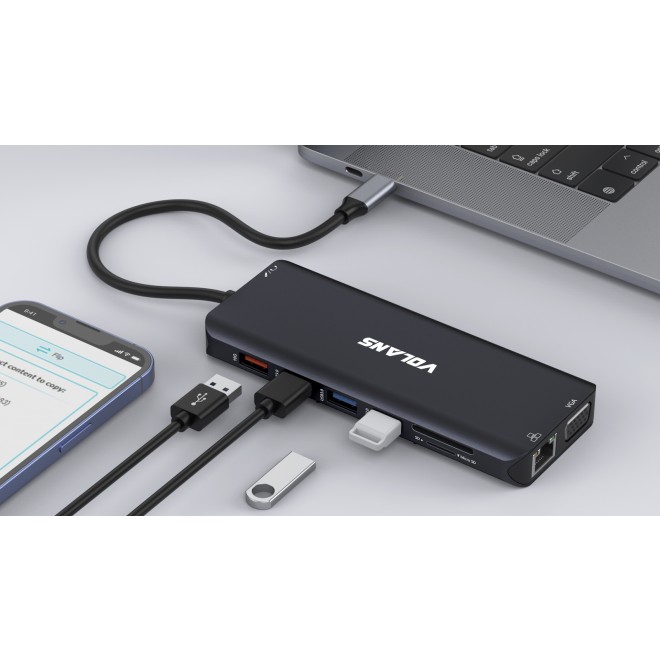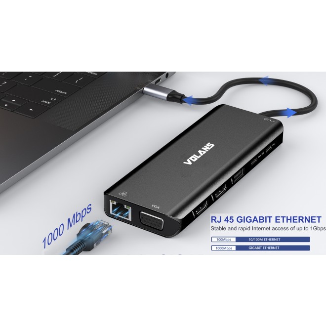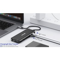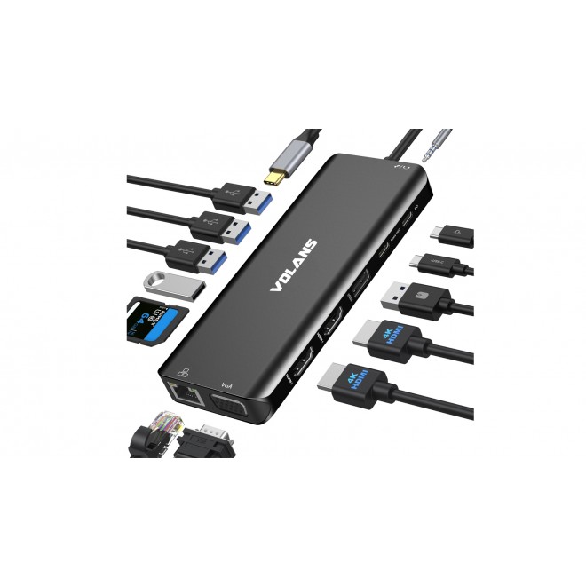 Truly Universal: Connect all you want - This USB-C Dock features a full array of ports ranging from 2x HDMI, 1x VGA, 1x RJ45 Gigabit Ethernet, 1x USB-C PD charging, 1x USB-C data transfer, 3x USB 3.0, 2x USB 2.0, 1x 3.5mm Audio/Mic, 1x TF & 1x SD card reader—the USB-C port and Data transmission from the same port. The USB-C port also supports Data transmission from the same port and power.
